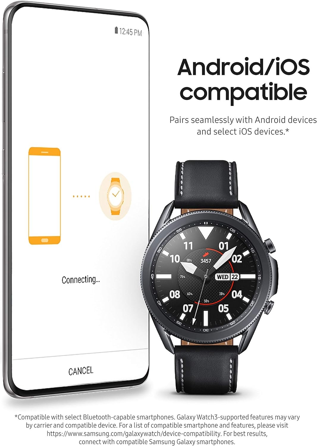 LEAVE YOUR PHONE BEHND: Galaxy Watch3 gives you the freedom to call, text, stream music and get notifications via Bluetooth connectivity